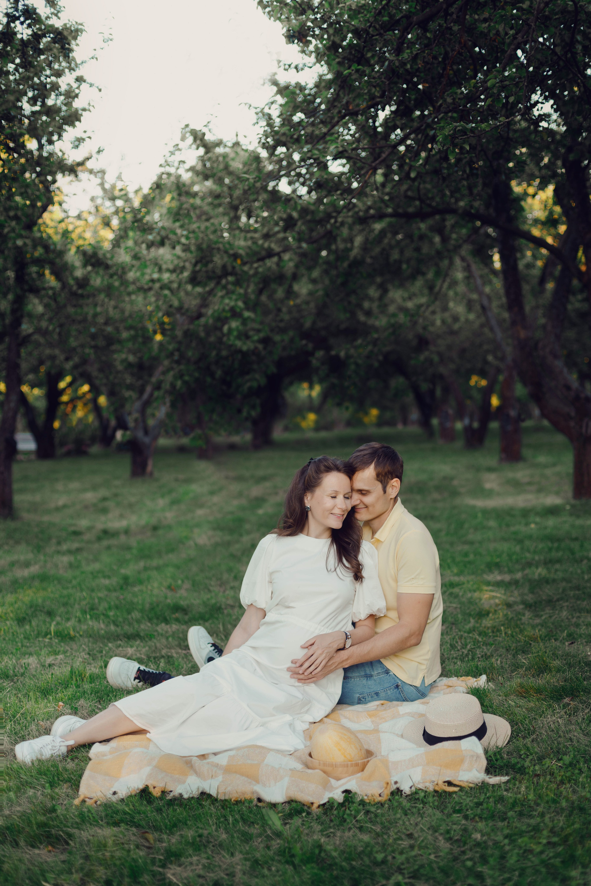 Две последовательные фотосессии для молодой семьи, выполненные с интервалом в год: первая на этапе беременности, вторая — для празднования первого дня рождения ребенка. Обе съемки проведены на природе в парковой зоне с использованием естественного освещения.